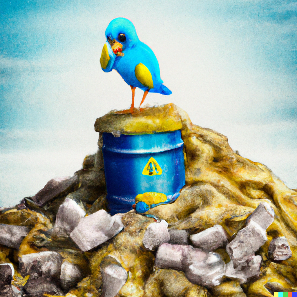 A Twitter bird suffering on a pile of toxic waste, photorealistic by Dall-E