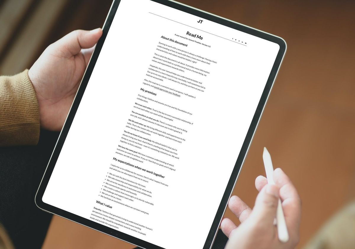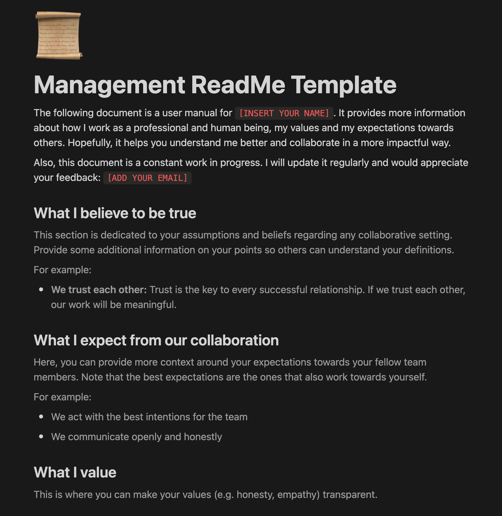 The Management Readme is a perfect way to exercise vulnerability and communicate your values, beliefs, and ways you operate in your workplace. Give it a try.